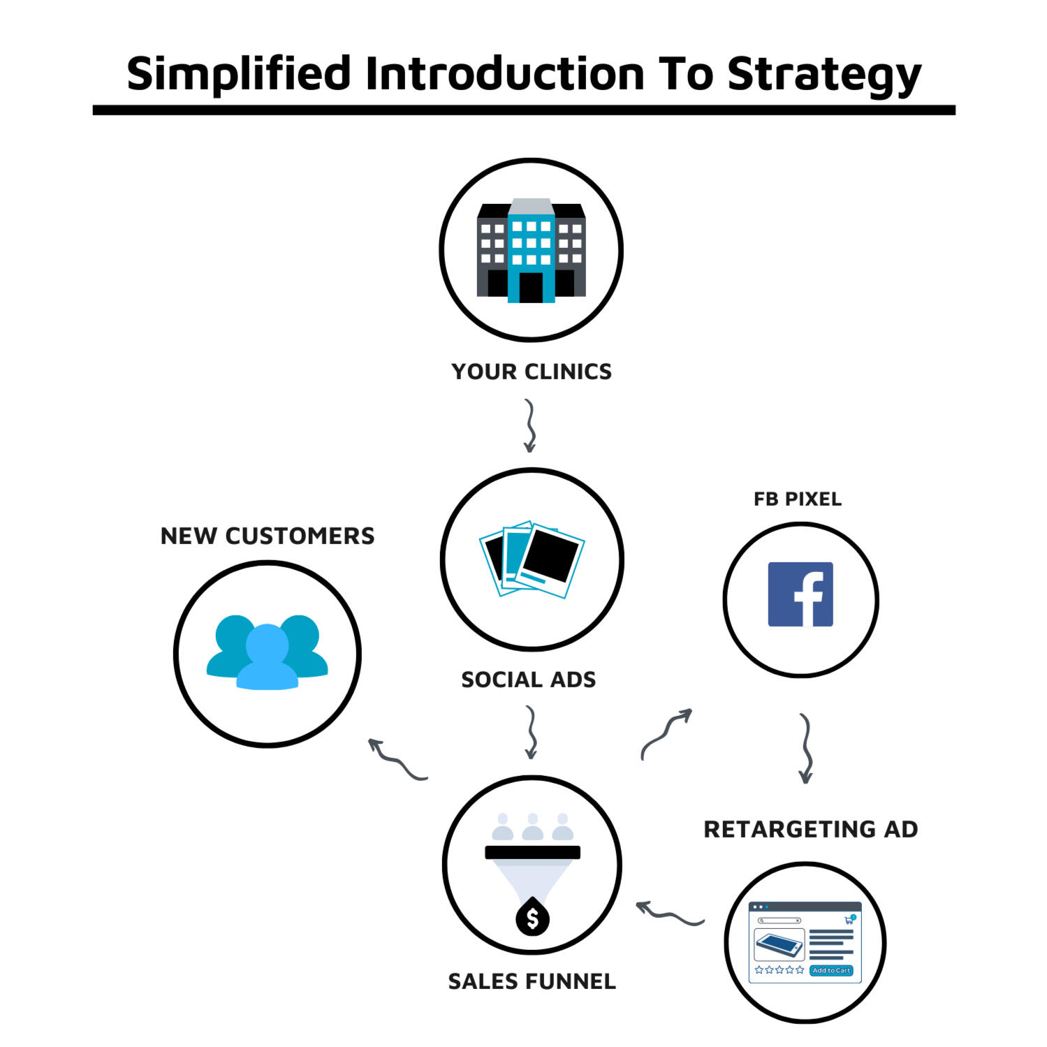 First and foremost we want you to understand that a successful Chiro advertising strategy has a lot of moving parts that need to work in conjunction to make it flow properly. However for simply explanation sake here is the approach to acquiring new customers from social ads. See simplied strategy steps and diagram below ⤵